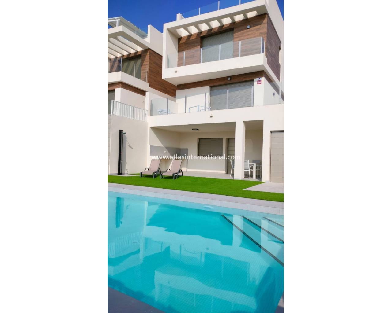 Detached Villas of 120 m2 with 3 bedrooms and 3 bathrooms, large living room areas of 40.47 m2 with integrated kitchen and bathroom with shower on the ground floor plus solarium on the rooftop of 44 m2. There is a Possibility to make a 4th bedroom on the ground floor. Situated close to Villamartin Golf course and the beaches of Orihuela Costa.