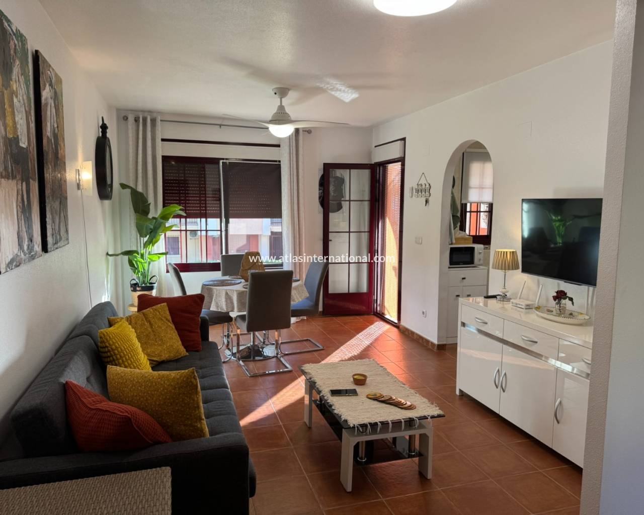 Denna vackra lägenhet på översta våningen, i sydostläge, har utsikt över de gemensamma trädgårdarna och poolen. Den ligger nära Torrevieja, i ett mycket lugnt område med bra bussförbindelser och många bekvämligheter.